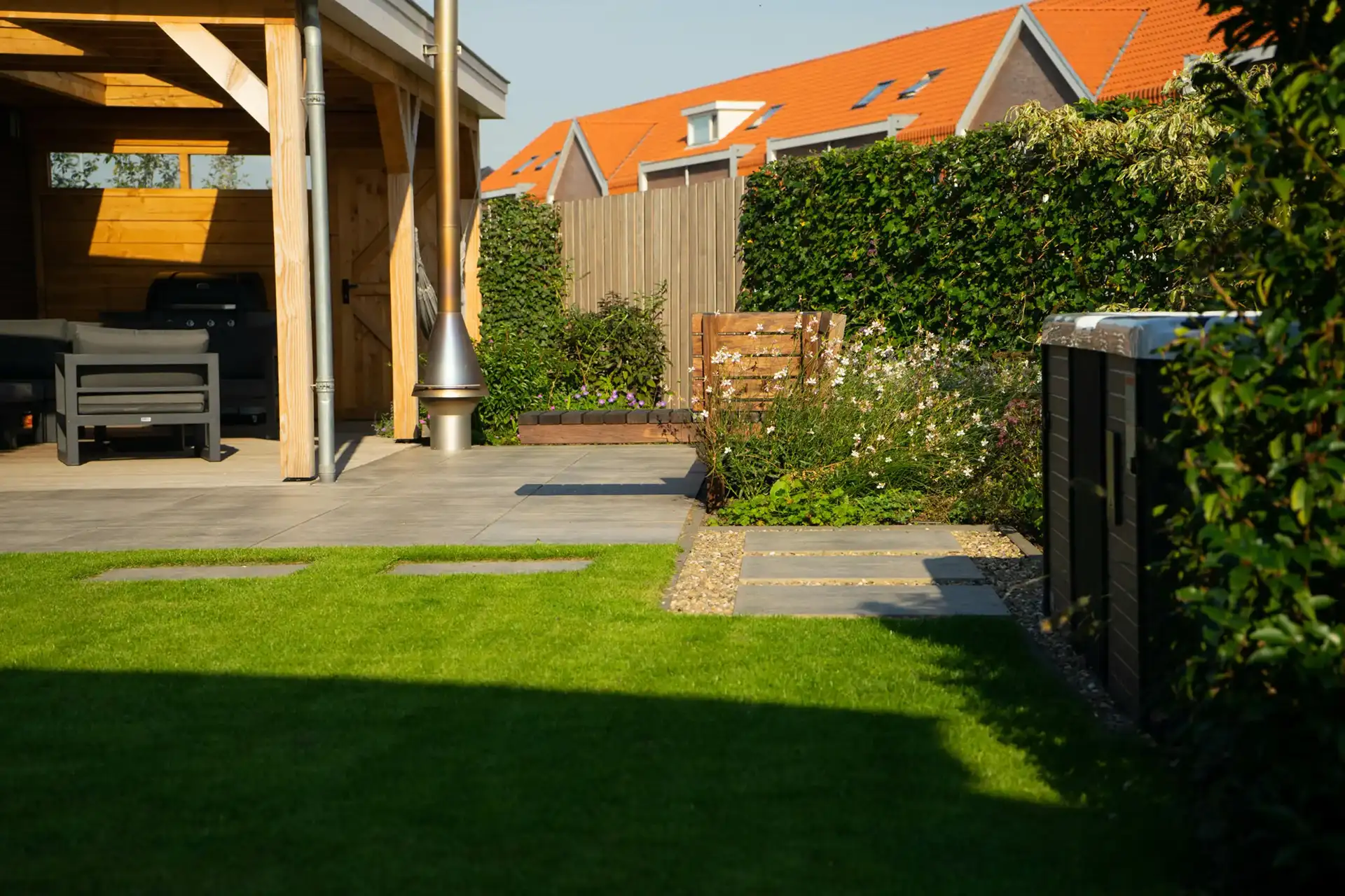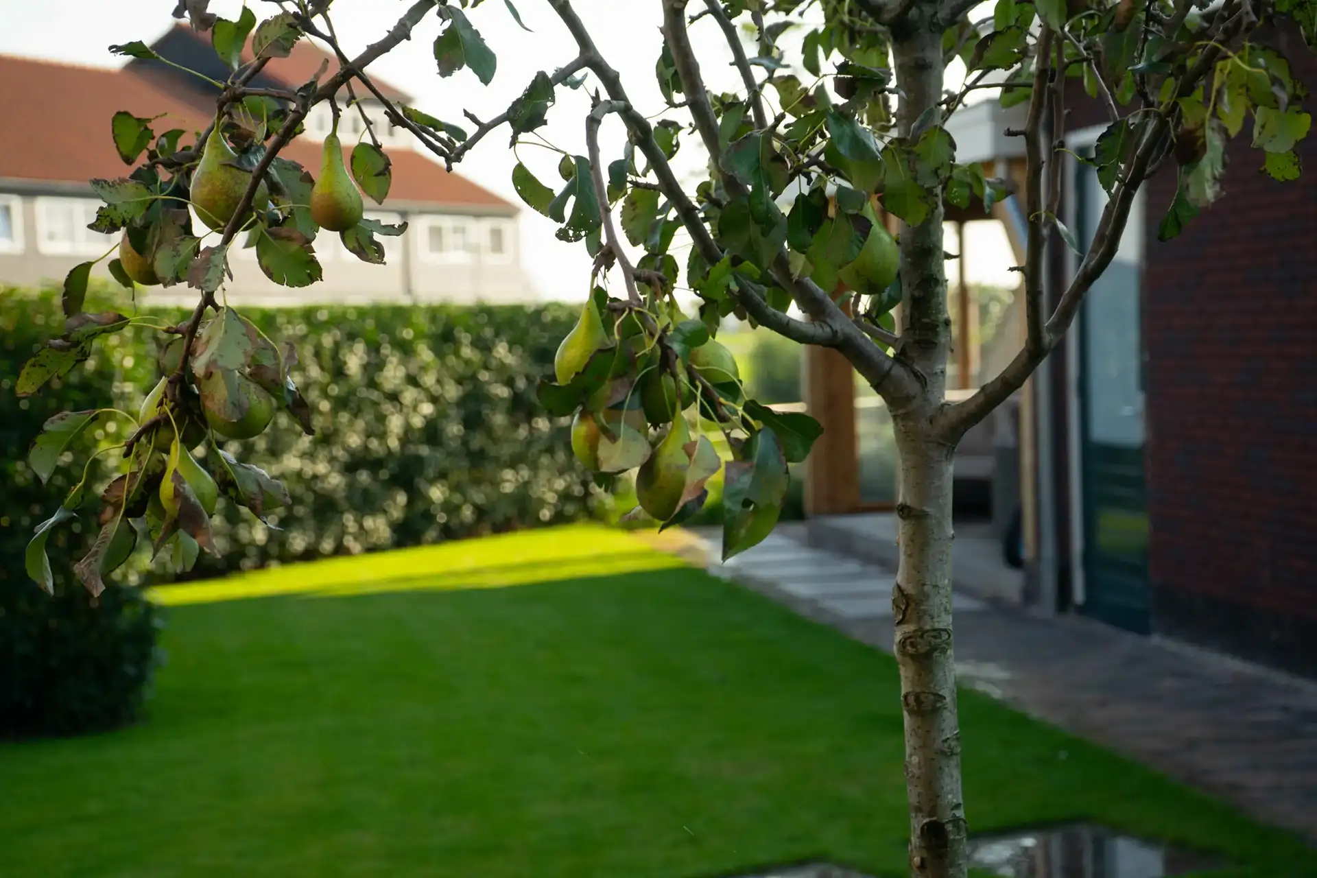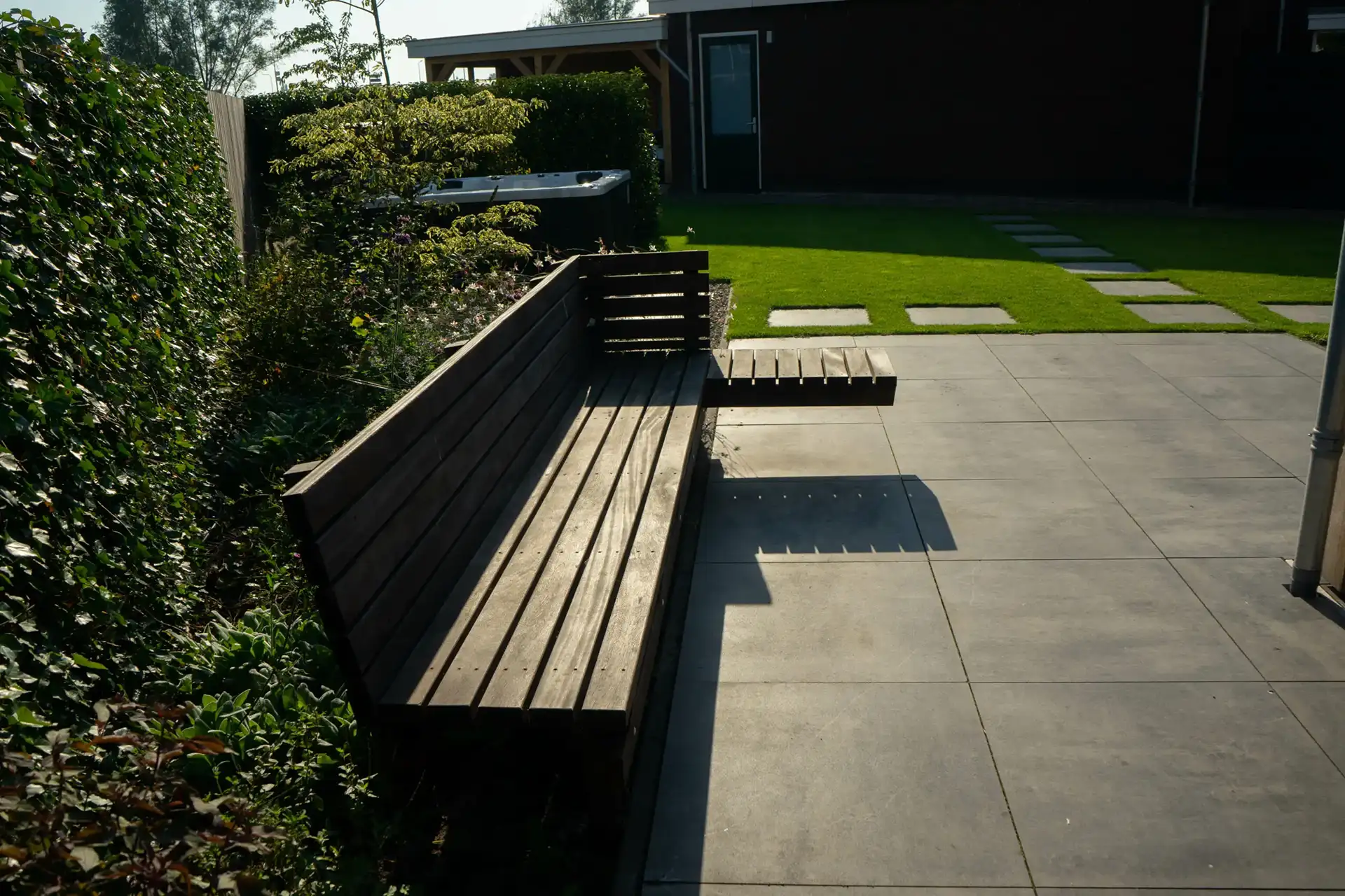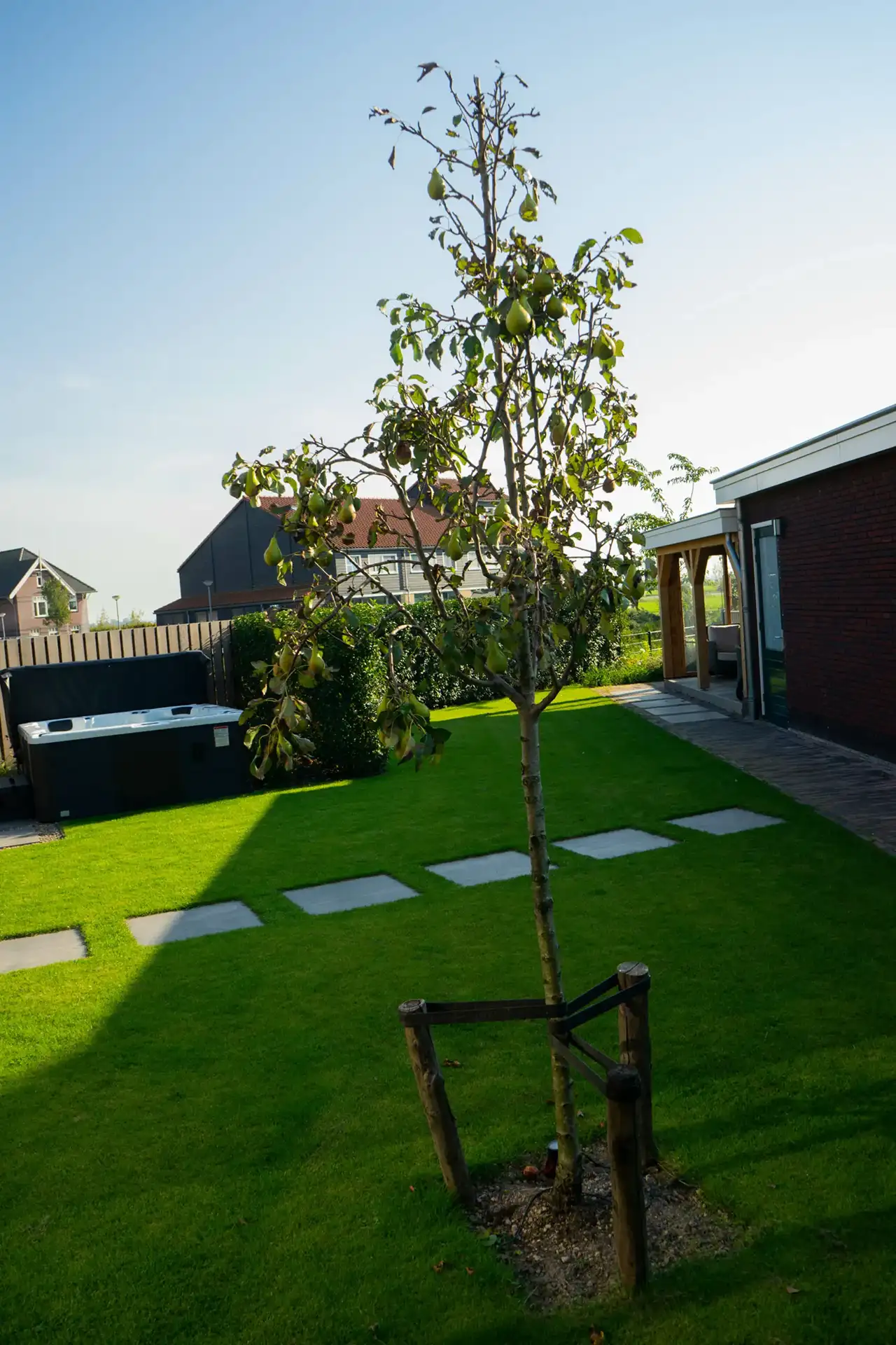 Een tuin om heerlijk in te ontspannen. De strakke basis is gecombineerd met rijke, groene elementen zoals fruitbomen en bloeiende borders. De jacuzzi maakt het plaatje compleet: een plek waar genieten centraal staat.