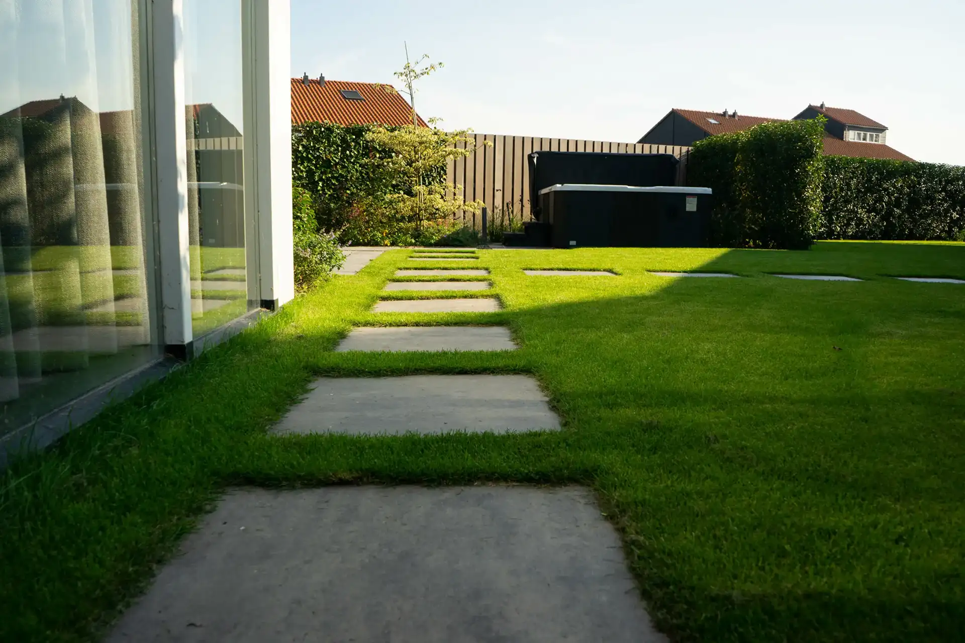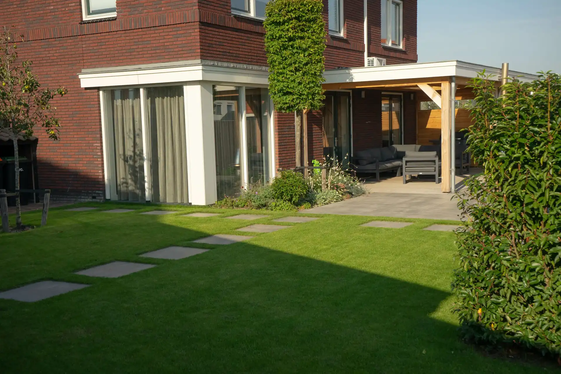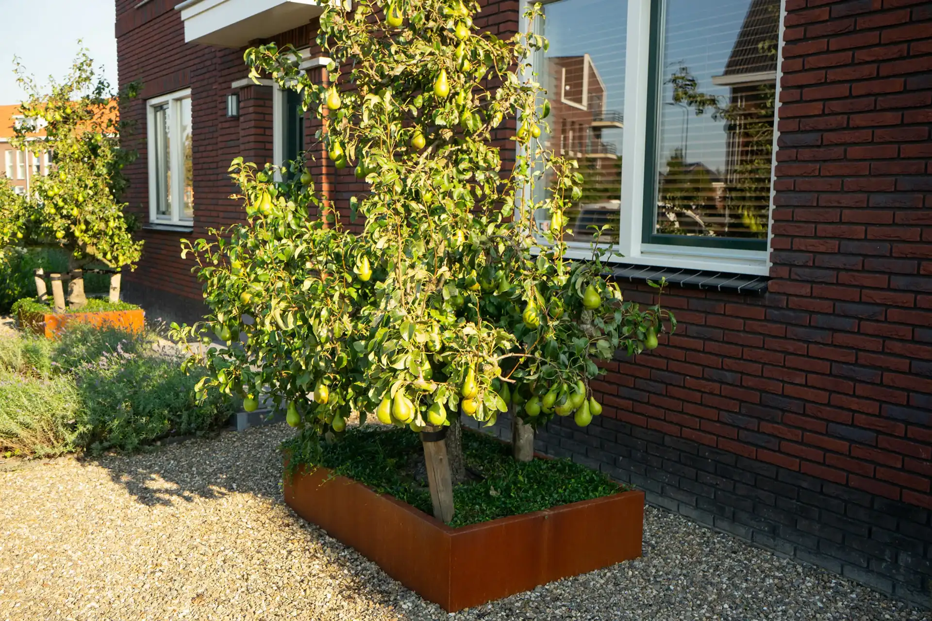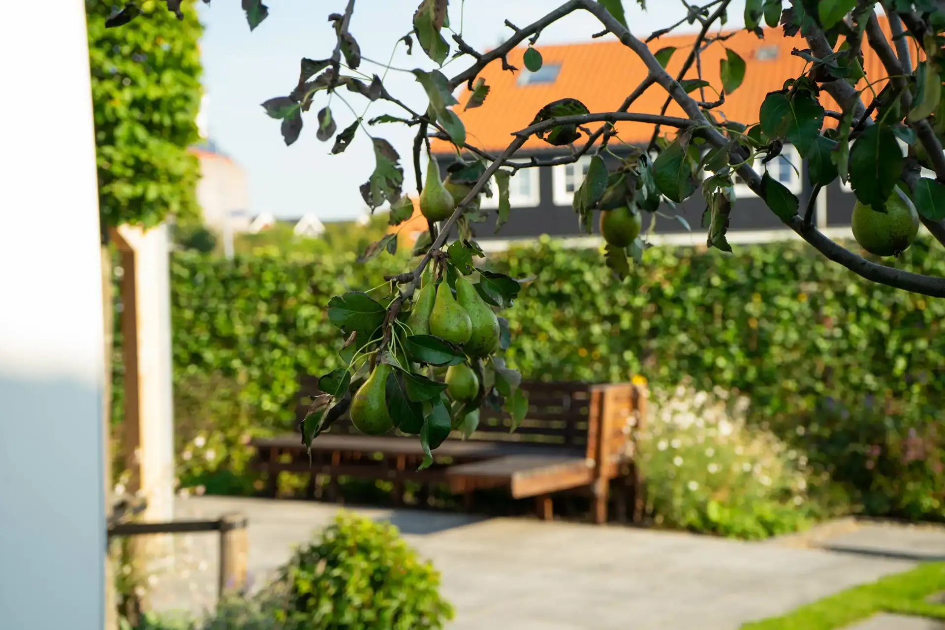 Een tuin om heerlijk in te ontspannen. De strakke basis is gecombineerd met rijke, groene elementen zoals fruitbomen en bloeiende borders. De jacuzzi maakt het plaatje compleet: een plek waar genieten centraal staat.