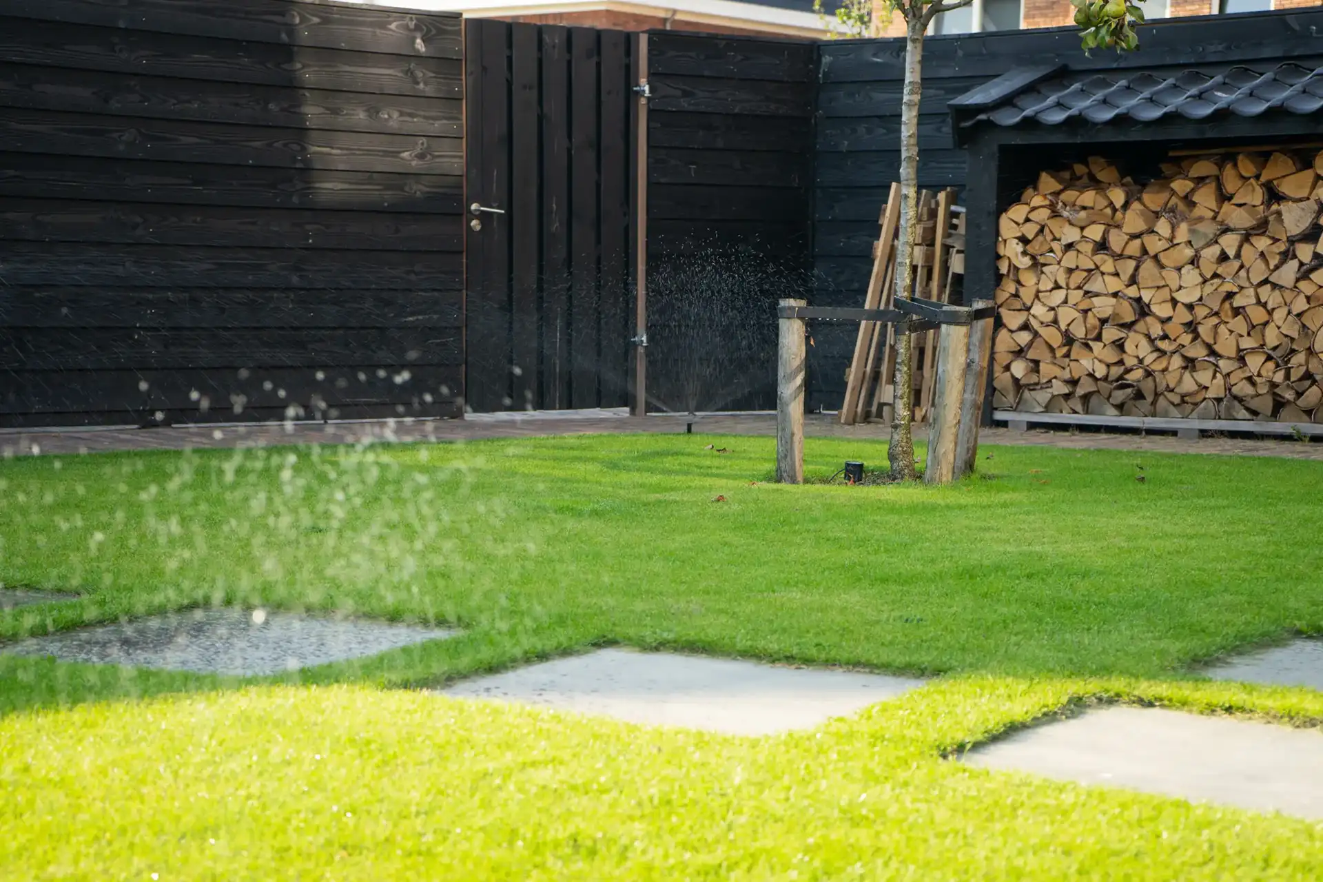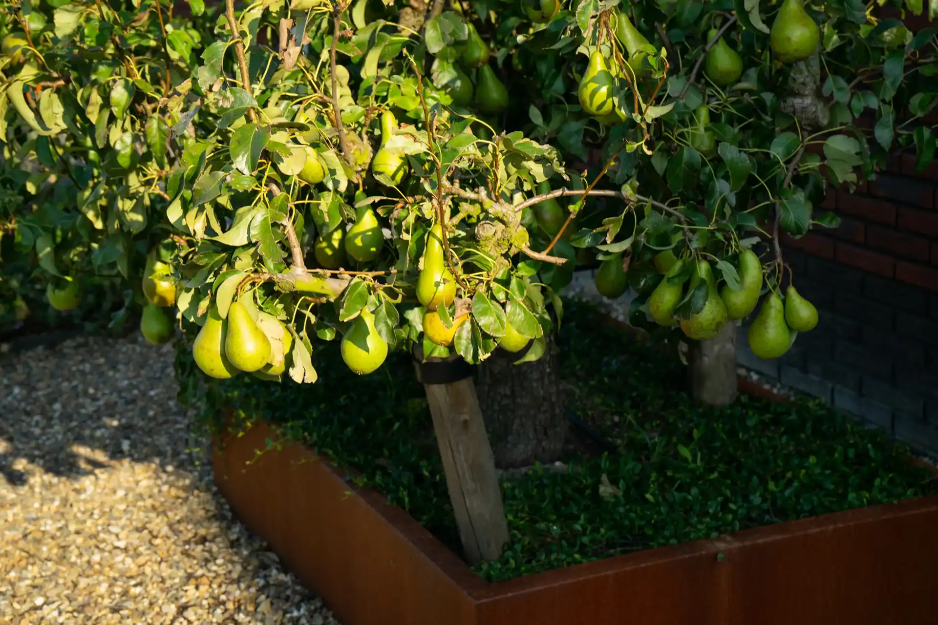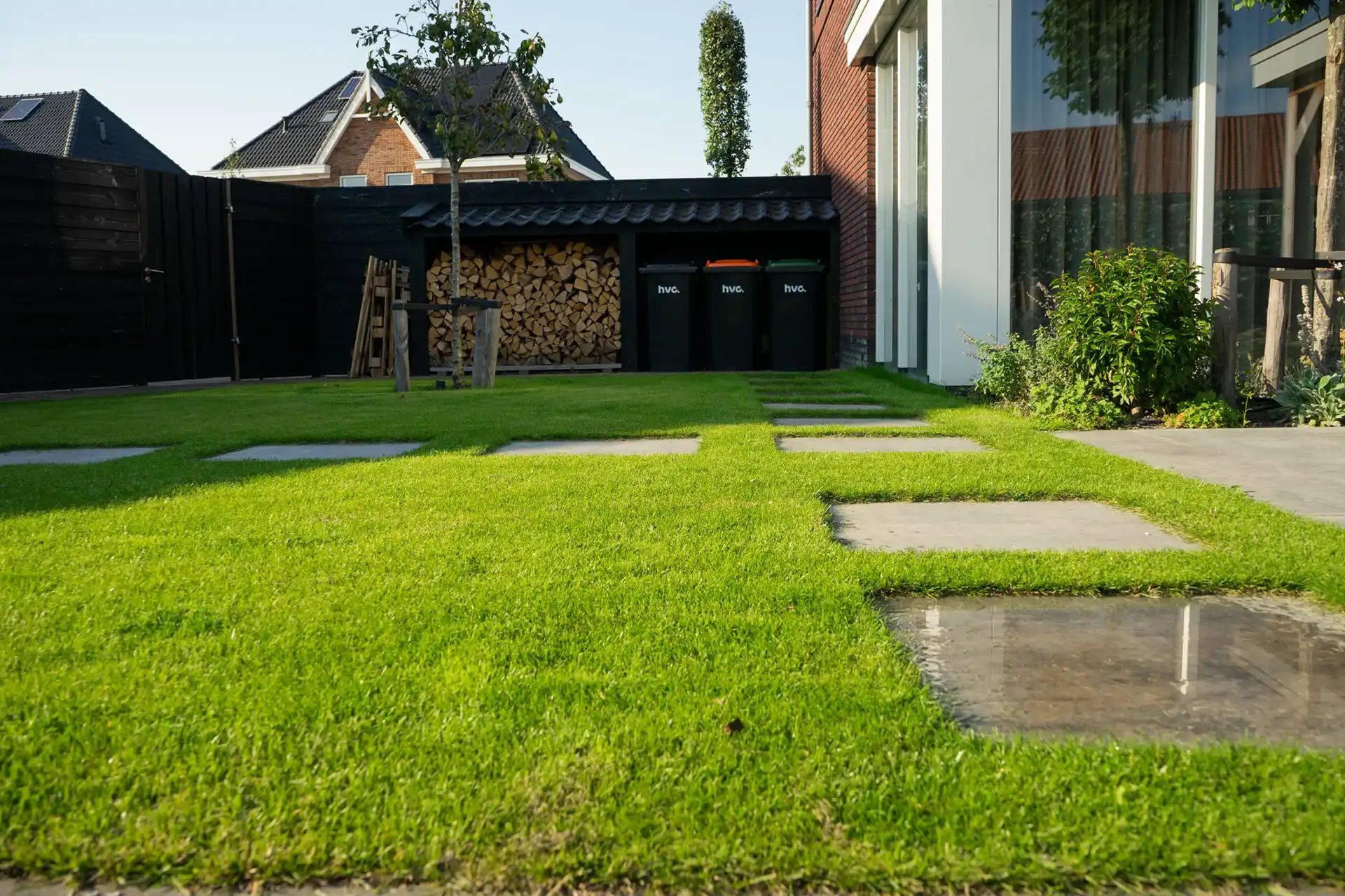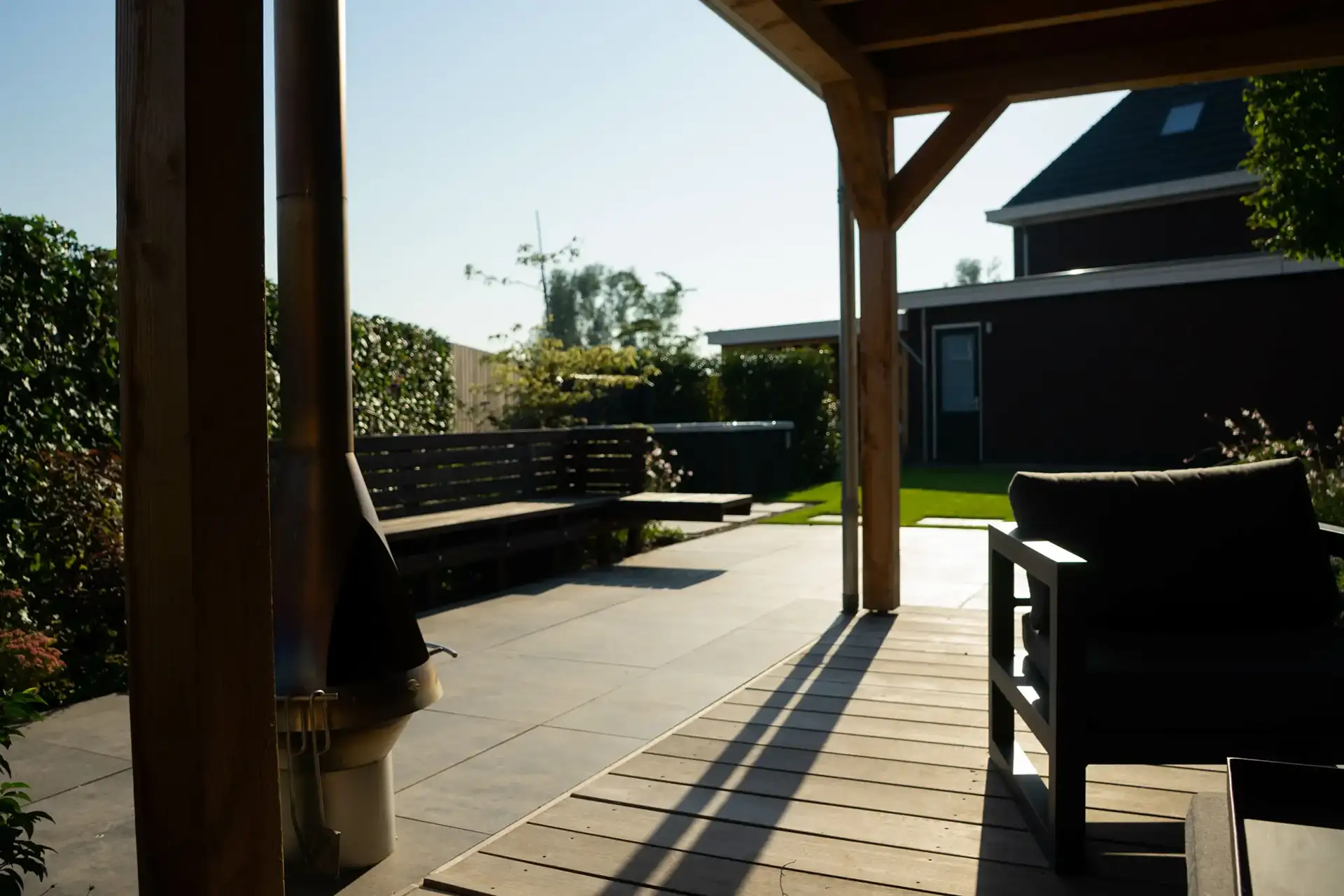 Een tuin om heerlijk in te ontspannen. De strakke basis is gecombineerd met rijke, groene elementen zoals fruitbomen en bloeiende borders. De jacuzzi maakt het plaatje compleet: een plek waar genieten centraal staat.